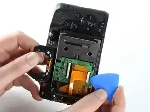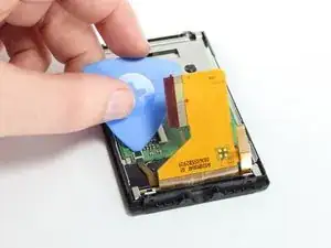 Один ленточный кабель соединяет блок дисплея с камерой. Используйте пику для вскрытия, чтобы приподнять черную защёлку, затем потяните за кабель, чтобы отсоединить его.