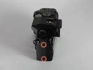 Удалите четыре указанных черных винта длиной 3,0 мм с нижней части камеры и корпуса видоискателя, используя отвертку PH0 Phillips.