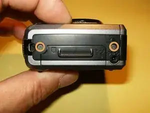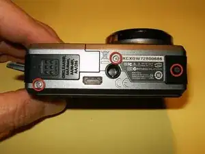 Выверните два винта с левой стороны; это одна из коротких сторон и та же сторона, где находится отсек для карты памяти.