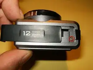 Снимите винт на правой стороне под боковой крышкой. Боковая крышка крепится к камере одним из винтов на дне, и крышка должна легко сдвинуться вниз, чтобы открыть доступ к винту.