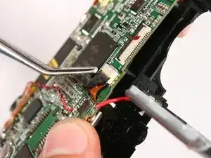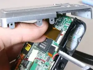 Найдите чёрную накладку, закрывающую ленту, соединяющую зум-объектив с логической платой.