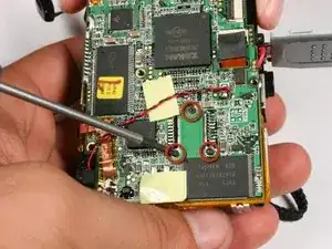 Воспользуйтесь отвёрткой Phillips #00, чтобы вывернуть и снять три (3 мм) винта, показанных на задней стороне логической платы.