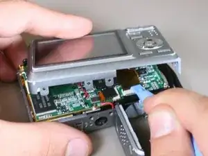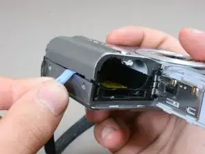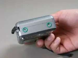 Найдите крышку отсека батареи в нижней части камеры. Сдвиньте крышку в сторону, используя инструмент для вскрытия iFixit.