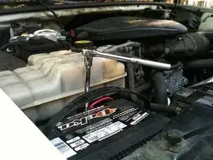 Теперь с помощью гаечного ключа на 15 мм ослабьте болт положительной клеммы так же, как вы снимали отрицательную.