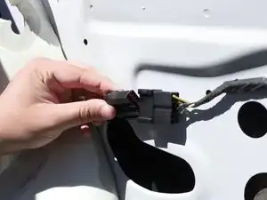 Вы обнаружите ещё один небольшой разъём, аналогичный тем, что были при отключении панели управления стеклоподъёмниками. Он управляет электрическим зеркалом и должен быть отключён перед откручиванием зеркала.