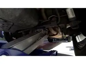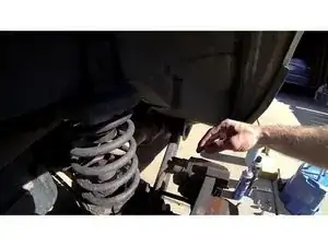 Установите стойку домкрата под трубой оси между точкой крепления нижнего рычага и кронштейном втулки стабилизатора