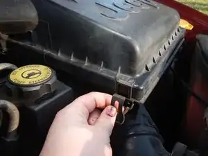 Просуньте пальцы в зазор между капотом и решёткой радиатора и найдите небольшую защёлку.