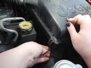 Отстегните все четыре зажима, которые расположены по углам корпуса воздушного фильтра и удерживают корпус вместе.
