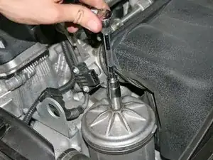 Используйте головку на 13 мм, чтобы ослабить болт крепления корпуса масляного фильтра.