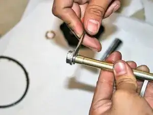 Снимите болт и отложите в сторонy. Некоторое количество масла может вытечь, поэтому подготовьте ветошь или полотенце.