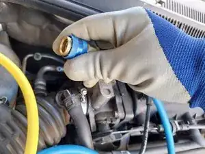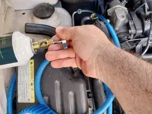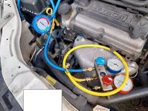 Я использовал компрессор, который обычно применяю для надувания шаров и шин. Я приварил к нему адаптер, чтобы подключить его к порту кондиционера. Я ПОЛНОСТЬЮ ОСОЗНАЮ, ЧТО ЭТО НЕПОДХОДЯЩИЙ ИНСТРУМЕНТ ДЛЯ ЭТОЙ РАБОТЫ, НО Поскольку ЭТО МОЙ АВТОМОБИЛЬ, Я ПРИНЯЛ ОТВЕТСТВЕННОСТЬ ЗА ОТСУТСТВИЕ ПОДХОДЯЩЕГО ВАКУУМНОГО НАСОСА.