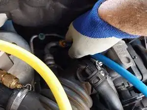 ОТКЛЮЧЕНИЕ ШЛАНГА: ПРИ РАБОТАЮЩЕМ ДВИГАТЕЛЕ (ОСТОРОЖНО), ПРОИЗВОДИМ ОТКЛЮЧЕНИЕ ШЛАНГА — быстро освобождаем быстросъёмное соединение, так же, как делали в STEP 8. Пример в видео: