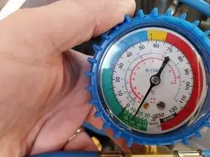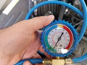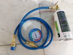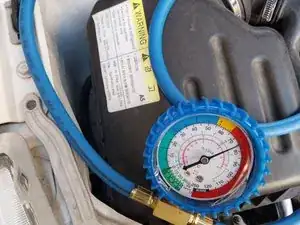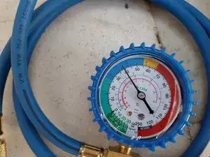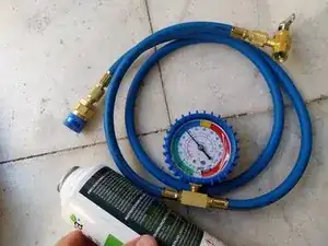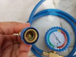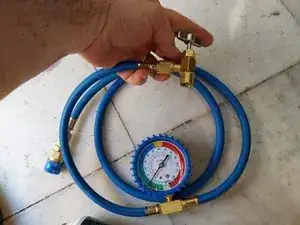 Что необходимо? Быстрая муфта для подключения к сервисному клапану низкого давления. Манометр + синие шланги (полученные при отсоединении клапана от ёмкости с хладагентом). Этот клапан/шланги используются для первоначальной проверки. В данном случае мы будем использовать их для: 1. Создания вакуума. 2. Пропуска хладагента для заправки.
