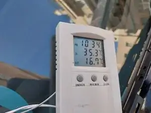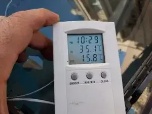 Установим двухдиапазонный термометр в воздуховыпускное сопло, чтобы измерять температуру окружающего воздуха и температуру воздуха на выходе.