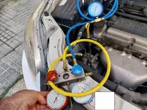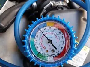 Можно подключиться к РАБОЧЕМУ СОЕДИНЕНИЮ НИЗКОГО ДАВЛЕНИЯ (ТОЛСТАЯ ТРУБКА), чтобы удалить крошечный остаток газа в контуре. Примечание: Если у нас есть баллон для восстановления газа, правильно будет собрать оставшийся газ в этот баллон и отнести его в уполномоченный сервис.