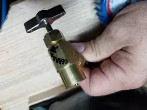 Готовим шланги для дозарядки. Отсоединяем от переходника манометра и устанавливаем на синий шланг кран баллона в ПОЛНОСТЬЮ ОТКРЫТОЕ положение, центральный штифт полностью втянут, чтобы можно было навинтить баллон.