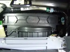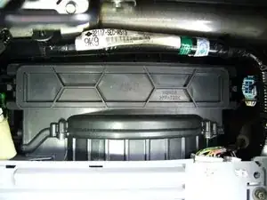 При опущенном бардачке виден блок вентилятора отопителя. В верхней части вентилятора расположена лоток для воздушного фильтра.