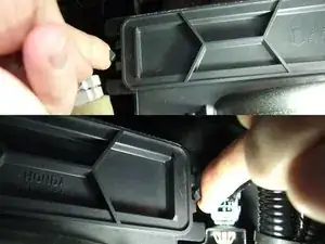 Лоток воздушного фильтра удерживается двумя защёлками спереди слева и справа. Просуньте руку и нажмите эти защёлки внутрь, в сторону центра.