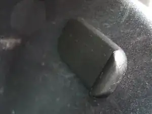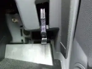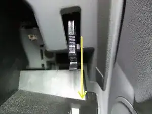 Освободите демпферную тягу бардачка с правой стороны, аккуратно нажав её вперёд в направлении двигателя. Защёлка «C» освободится с штифта, и конец тяги выйдет из отверстия.