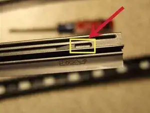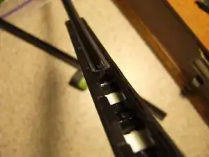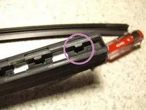 Поскольку Вы ещё не сняли старый вкладыш, Вы не видите, с чем взаимодействует второй паз. Вдоль внутренней части щётки находятся серии скоб, через которые проходит этот паз. Отдельный карман на «LOCK»-конце останавливается на зубцах крайней скобы на любом конце узла щётки.