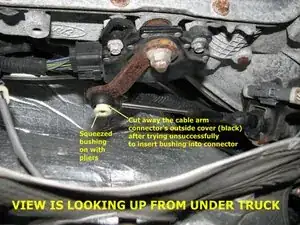 Заберитесь под грузовик со стороны двери водителя на спине. Подвиньтесь к середине грузовика и посмотрите вверх, чтобы найти кабель трансмиссии и его соединитель с трансмиссией. Он больше не будет прикреплен. Залезьте вверх и наденьте его обратно на рычаг трансмиссии. Выйдите из-под грузовика и переключите на скорость. Вам, возможно, придется повторять это каждый раз, когда вы переключаете передачи.