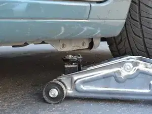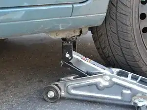 Поддомкратьте передний правый угол автомобиля, установив домкрат под длинную вертикальную часть рамы непосредственно за колесной нишей.