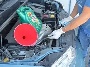 Одной рукой удерживайте воронку в отверстии. Влейте 4,5 кварты масла через воронку.