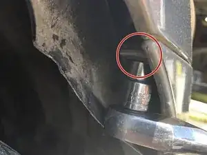 После снятия этих двух пластиковых защёлок можно поддеть пластиковый подкрылок с помощью плоской отвертки, чтобы открыть доступ к скрытому болту.