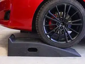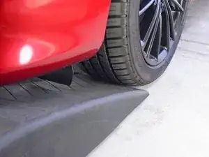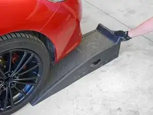 Поддвиньте первый пандус непосредственно перед передним колесом со стороны водителя, пока он не коснётся резины шины.