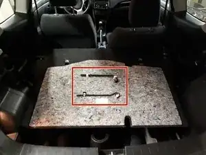 Откройте багажник, снимите покрытие пола и достаньте рукоятку домкрата и ключ для гаек.