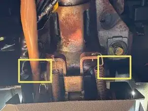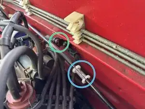 Гнущаяся металлическая защелка (зеленая) удерживает белую пластиковую фиксирующую часть (синюю) троса спидометра на месте.