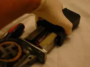 Оттяните чёрный пластиковый кожух электродвигателя от корпуса шестерён. Он не прикреплён, держится за счёт трения, поэтому равномерное усилие должно его сдвинуть.