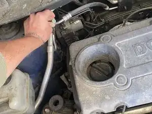 Риски: Двигатель может быть горячим, если машина была включена в последние 45 минут. Наденьте защитные очки и перчатки на протяжении всей процедуры перезарядки кондиционера. Установите машину в нейтраль и включите ручной тормоз перед началом.