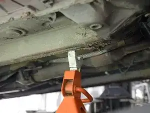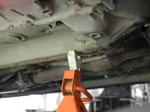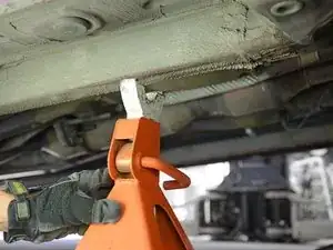 Вы также можете поднять одновременно оба передних (или оба задних) колеса, используя точку опоры, расположенную посредине между передними (или задними) колесами. У некоторых автомобилей есть выделенная точка для этого; в других случаях потребуется разместить домкрат под передней или задней подрамником.