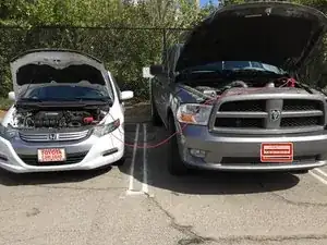 На этой фотографии может создаться впечатление, что клеммы подключены неправильно на обоих автомобилях. Следуйте предыдущим инструкциям и используйте заземляющий провод на Insight.