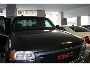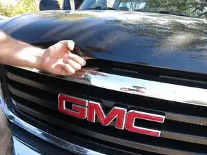 Найдите защёлку расположения капота между решёткой радиатора и капотом, непосредственно над эмблемой «GMC» на передней части автомобиля.