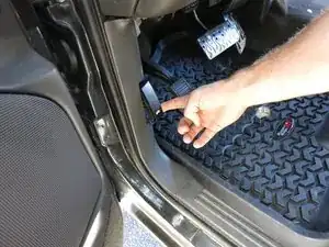 Найдите рычажок открывания капота в автомобиле — он расположен со стороны водителя под приборной панелью слева от педали стояночного тормоза.