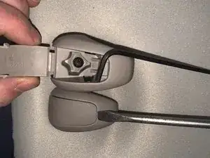Вставьте плоскую отвертку в верхнюю часть щели заднего потолочного фиксатора. Аккуратно шевелите ею взад-вперед, пока фиксатор не раскроется и не откроется доступ к винту.
