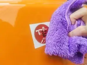 Это смягчит клей под наклейкой и упростит следующие шаги.
