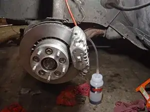 Если после прокачки всех четырёх углов автомобиля в баке осталось ещё немного жидкости, необходимо оставить шланг прокачки на штуцере переднего пассажирского суппорта.