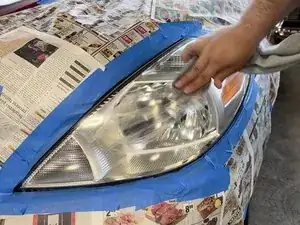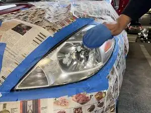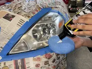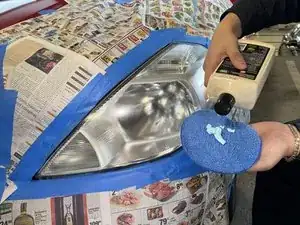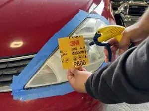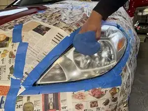 Постоянно опрыскивайте фару и наждачную бумагу водой. Поверхность должна оставаться влажной во время шлифовки.