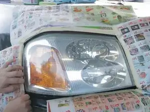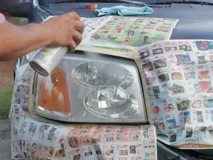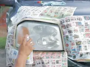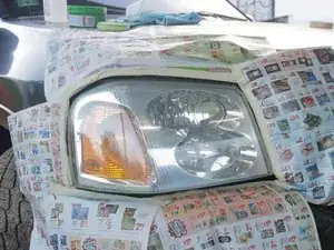 Приклейте газет или пластиковые пакеты по крайней мере на фут в радиусе вокруг фар, чтобы не повредить лакокрасочное покрытие автомобиля при нанесении прозрачного покрытия.