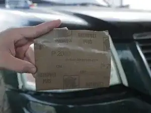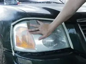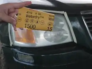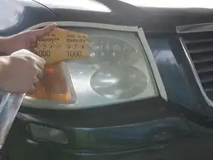 Используйте влажную наждачную бумагу зернистостью 1000 и лёгкое давление, шлифуйте пластик круговыми движениями. Когда заметите, что мелкие царапины выглядят одинаково по всей поверхности фары, шлифуйте горизонтально, пока все мелкие царапины не станут горизонтальными.
