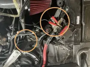 В рассмотренном автомобиле аккумулятор расположен в багажнике. Также имеется удалённая положительная клемма в передней части (обведена оранжевым на фото 2 шага 3). Если отрицательной клеммы нет, закрепите заземляющий зажим на оголённом металле кузова или блоке двигателя.