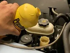Step 10: Займитесь за рулём и нажимайте на педаль сцепления. ~ Это выдавит старую жидкость из системы в бутылку. Во время нажатия подливайте в резервуар ещё тормозную жидкость DOT4. (Убедитесь, что резервуар не опустеет полностью во время этой операции)