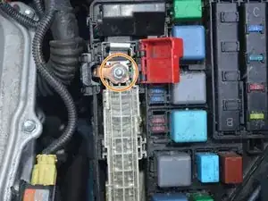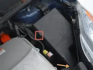 Вторая защёлка расположена в нижней части блока предохранителей и её довольно трудно увидеть. Оранжевая стрелка указывает место расположения защёлки.