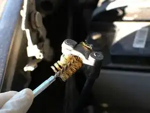 Используйте мягкую металлическую щетку, как показанная латунная щетка, чтобы очистить коррозию изнутри клеммы. Затем обработайте это спреем для чистки электрических контактов.