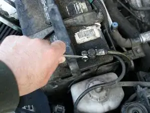 Используйте ключ на 10 мм, чтобы отключить отрицательный клемму аккумулятора, а затем положительную.