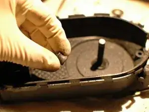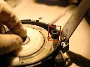 Поднимите металлическую втулку шестерни и снимите её с корпуса, отложите в сторону.