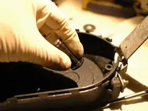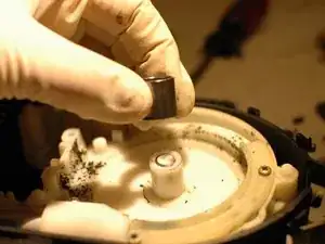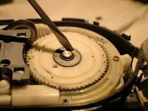 Используйте металлическую лопатку или плоскую отвёртку, чтобы снять стопорное кольцо, удерживающее шестерни на втулке и валу.